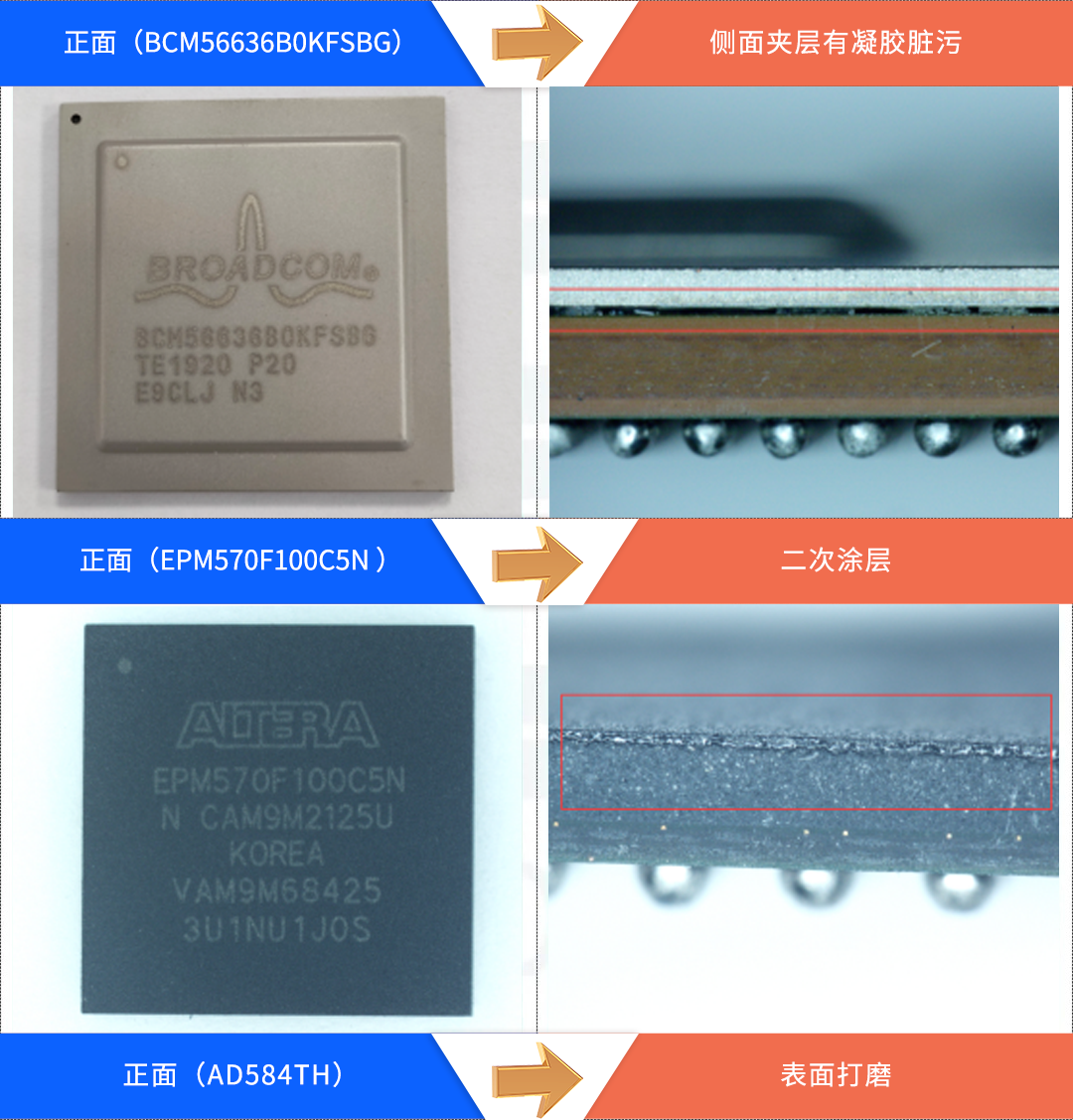 Appearance inspection refers to confirming whether the received chip quantity, inner packaging, humidity indicator, desiccant requirements, and outer packaging meet the requirements. The appearance inspection of a single chip mainly includes: the typing, year, place of origin, whether it has been recoated, the status of the pins, whether there are re polishing marks, unknown residues, and the position of the manufacturer's logo.