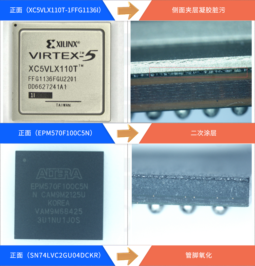 Appearance inspection refers to confirming whether the received chip quantity, inner packaging, humidity indicator, desiccant requirements, and outer packaging meet the requirements. The appearance inspection of a single chip mainly includes: the typing, year, place of origin, whether it has been recoated, the status of the pins, whether there are re polishing marks, unknown residues, and the position of the manufacturer's logo.