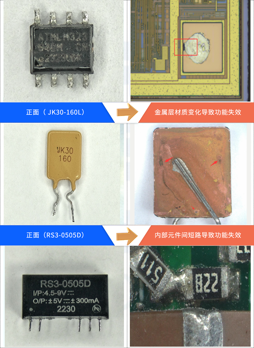 通过专业失效分析设备,借助各种测试分析技术和分析程序确认电子元器件的失效现象,分辨其失效模式和失效机理,确认最终的失效原因,并提出改进设计和制造工艺的建议,防止失效的重复出现。