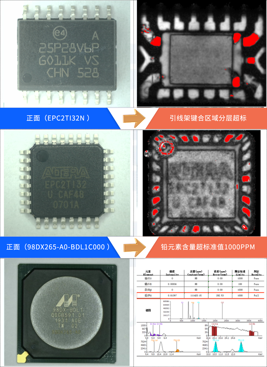 常用的无损检测方法有:外观检测、X-Ray检测、热传导测试、超声检测、XRF检测等。