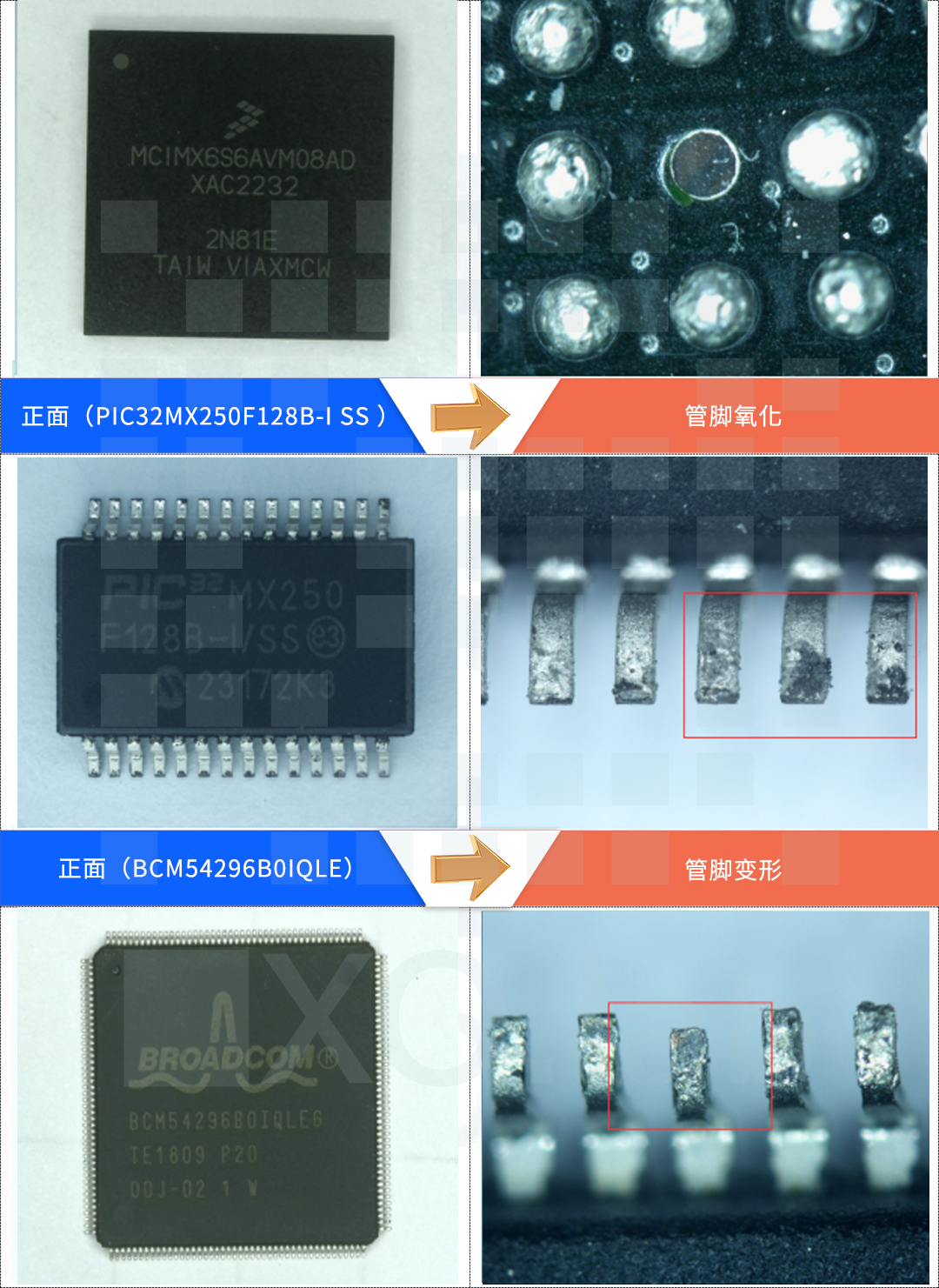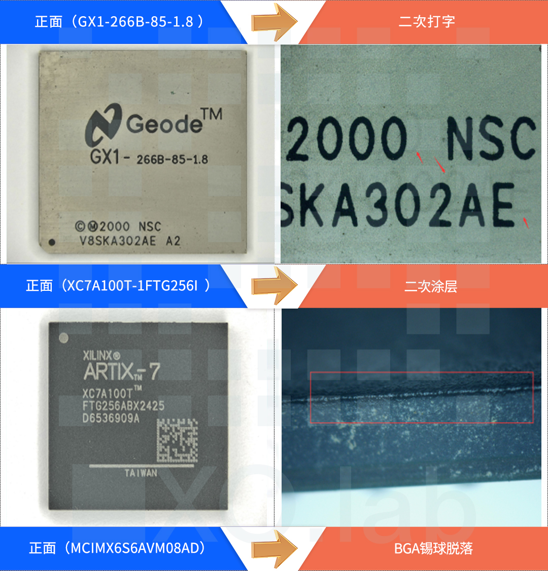Appearance inspection refers to confirming whether the received chip quantity, inner packaging, humidity indicator, desiccant requirements, and outer packaging meet the requirements. The appearance inspection of a single chip mainly includes: the typing, year, place of origin, whether it has been recoated, the status of the pins, whether there are re polishing marks, unknown residues, and the position of the manufacturer's logo.