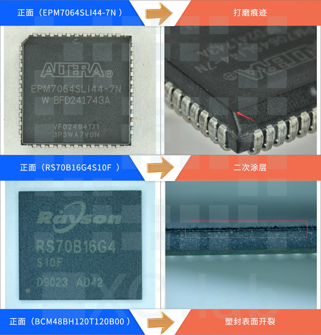 外观检测是指确认收到的芯片数量、内包装、湿度指示、干燥剂要求和外包装是否符合要求。单个芯片的外观检测主要包括:芯片的打字、年份、原产地、是否重新涂层、管脚的状态、是否有重新打磨痕迹、不明残留物、以及厂家logo的位置等。