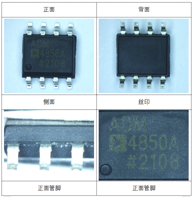 前段时间,创芯在线检测中心收到客户送检的一批标注为ADI品牌,型号为ADM4850ARZ-REEL7的产品。事后我们的工程师也不禁感叹,现在的仿冒技术水平真的已无法通过肉眼来分辨了。话不多说,我们一起来看看。